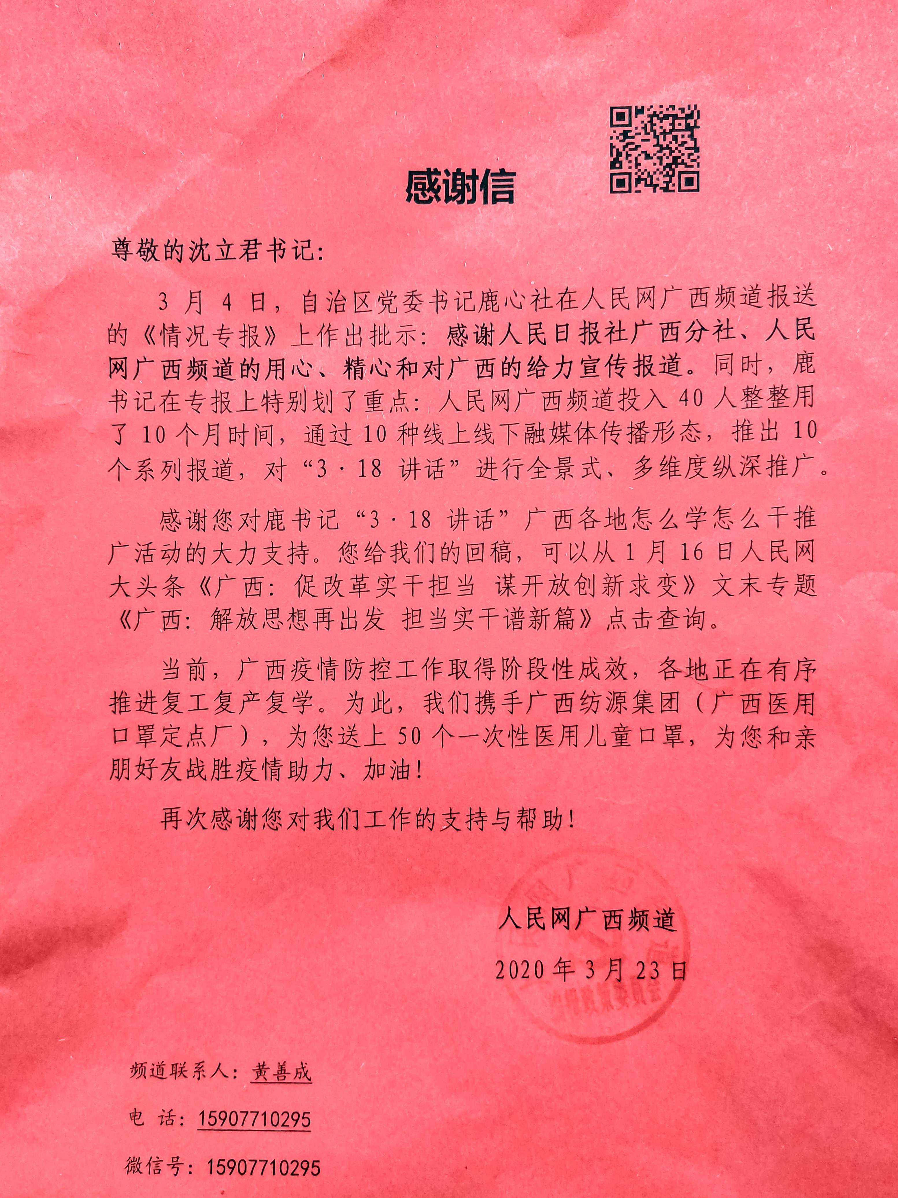 人民网广西频道同时随信赠送口罩50个,用于防疫工作。