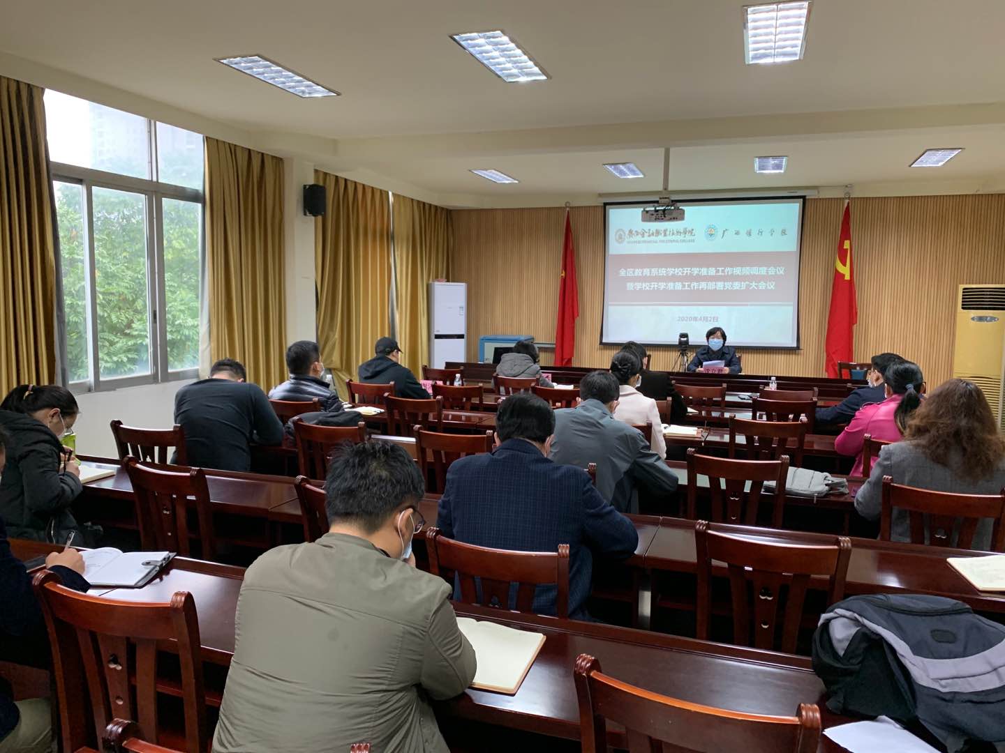 4月2日下午,在全区教育系统学校开学准备工作视频调度会结束后,万象城官网迅速贯彻落实会议精神,及时在万象城官网东校区办公楼6楼会议室召开学校开学准备工作再部署党委扩大会议,校领导、各二层单位主要负责人参加会议。