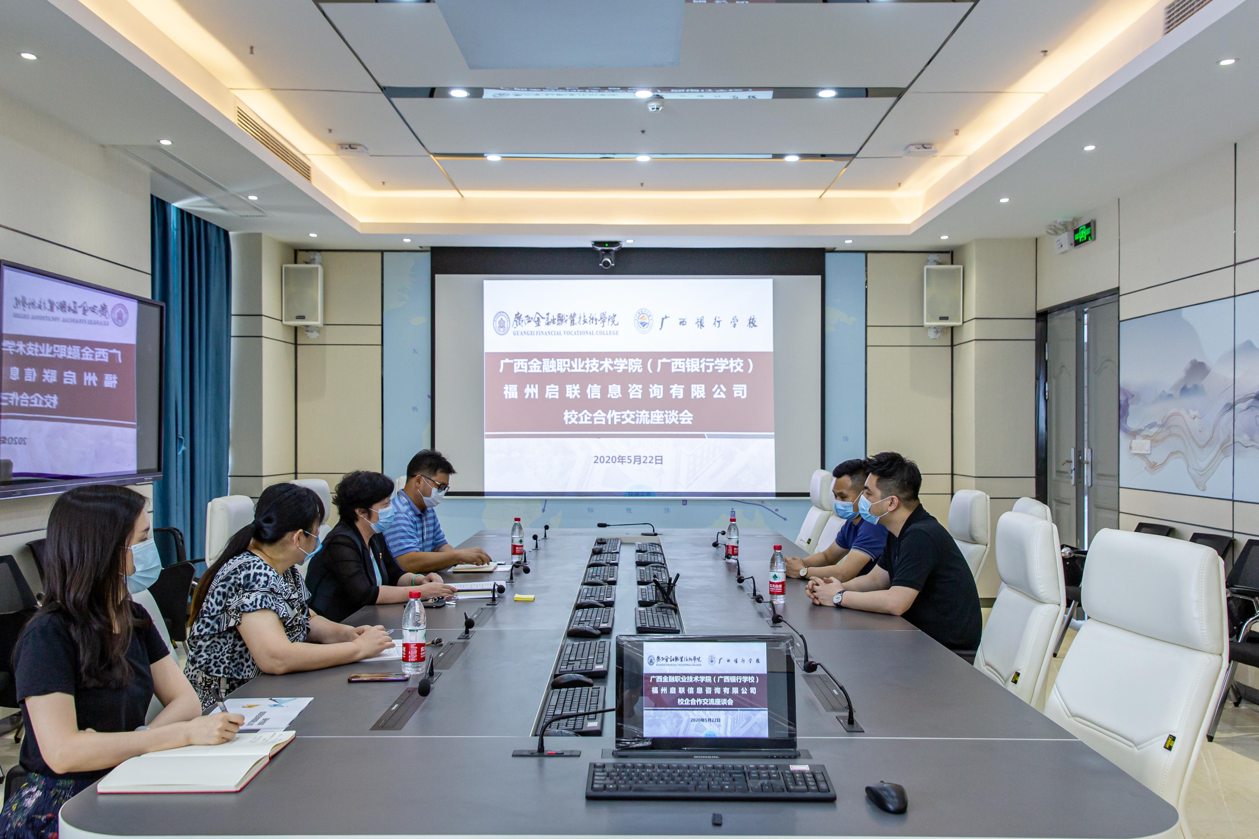 5月22日下午,启联信息咨询有限公司到访万象城官网,党委书记沈立君及党政办公室、旅游管理系主要负责人在西校区“一带一路”会议室接待了总经理张龙辉一行,双方就校企合作相关事宜进行了座谈。