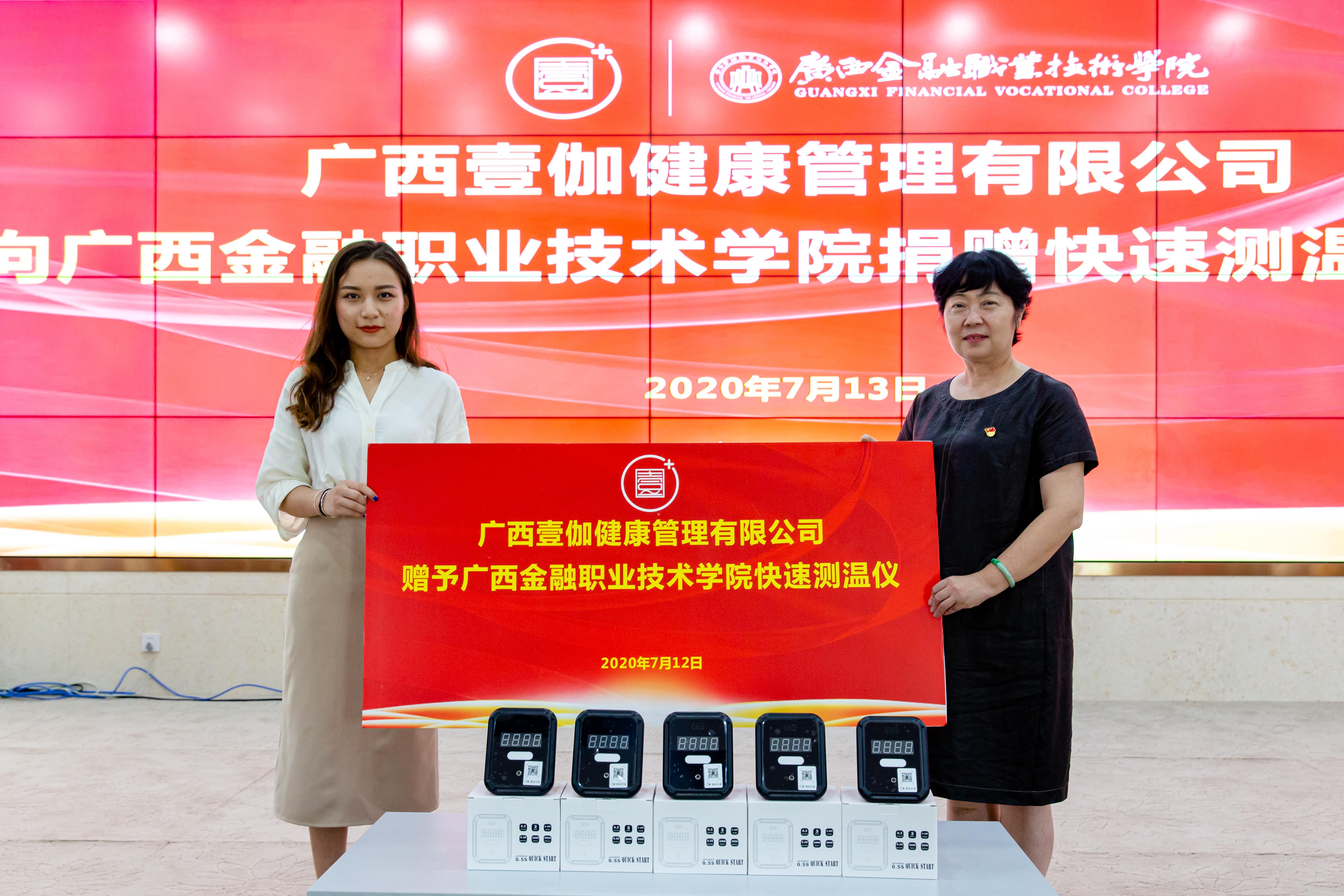 7月12日下午,广西壹伽健康管理有限公司总经理、万象城官网金融事务专业2017级校友李昕馨为学校防疫常态化捐赠了一批快速测温仪,助力学校疫情防控工作。