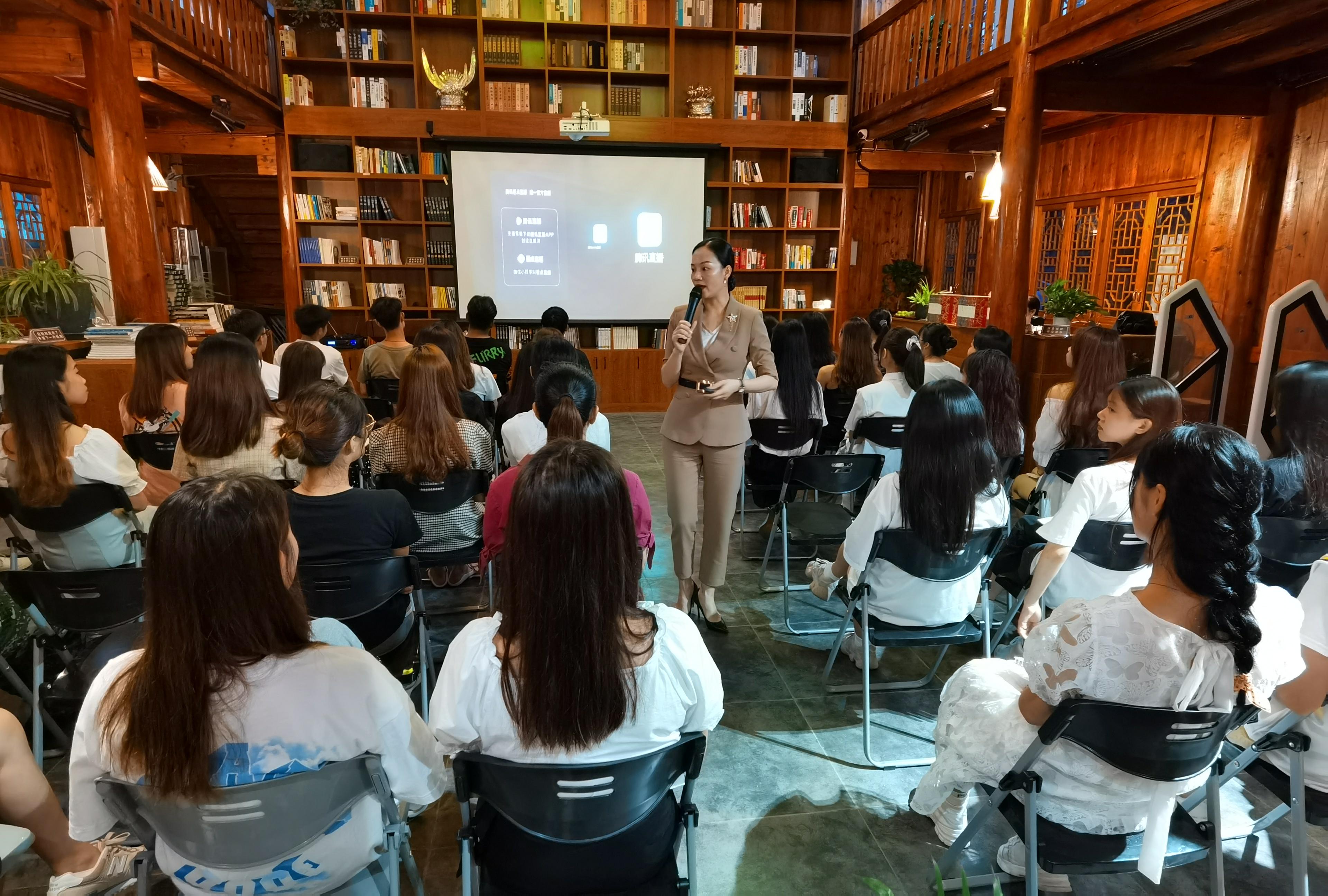近年来,随着互联网技术的发展,直播带货的火爆,全国进入了前所未有的全民直播盛况。万象城官网旅游管理系紧跟时代潮流,顺应当下直播趋势,打造校园直播新模式,与腾讯直播MCN短社播广西基地盟主美霖学院携手打造直播平台,合力开启直播带货课堂。7月14日晚,旅游管理系邀请到美霖学院联合创始人、美霖学院线上商学院院长、广西短社播MCN机构主播孵化学院院长卢淑艳导师亲临awc77万象城官网民族书院授课。