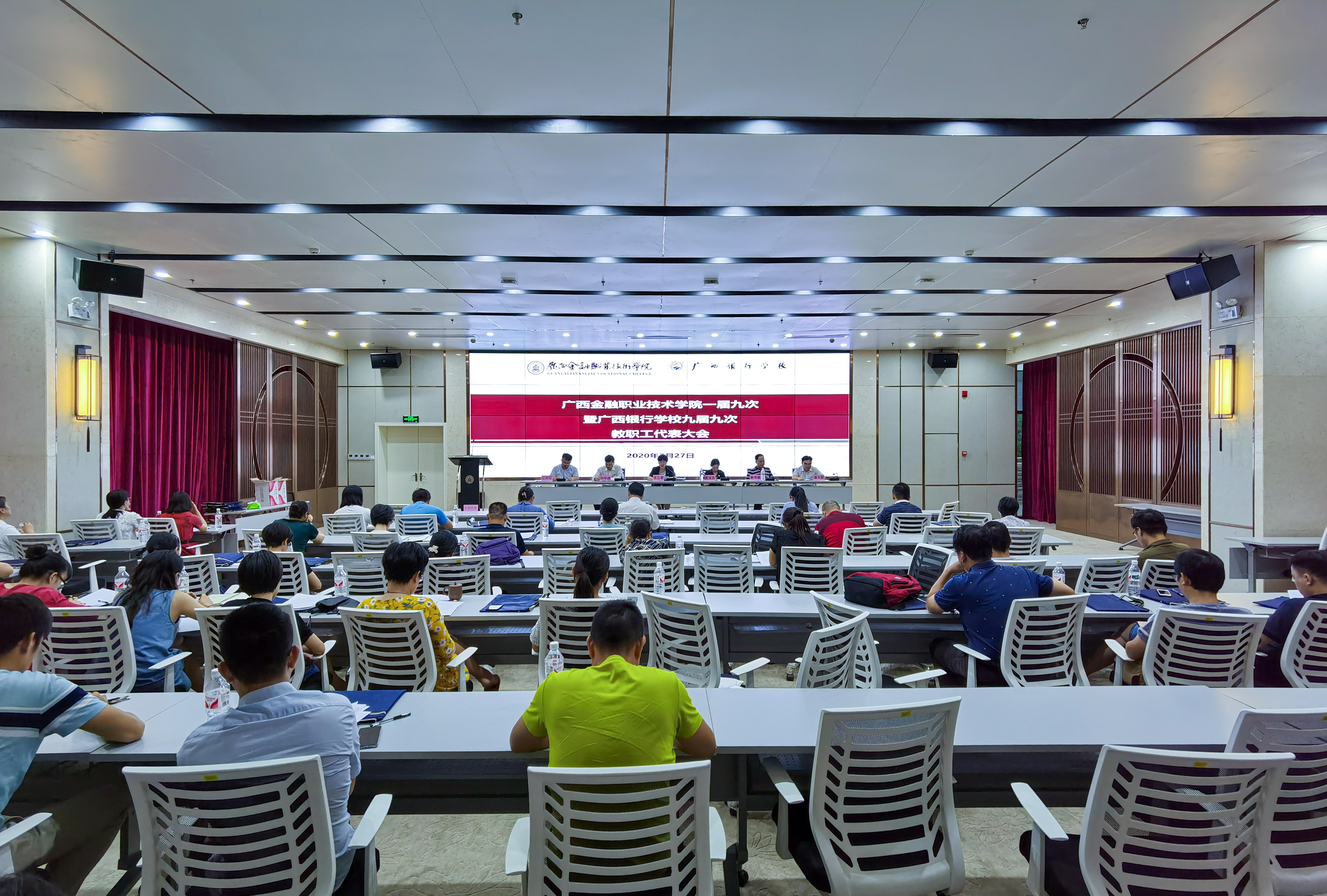 7月27日,awc77万象城官网一届九次暨广西银行学校九届九次教职工代表大会在西校区道德大讲堂召开。40名正式代表和22名列席代表参加会议。会议由工会主席石利军主持。