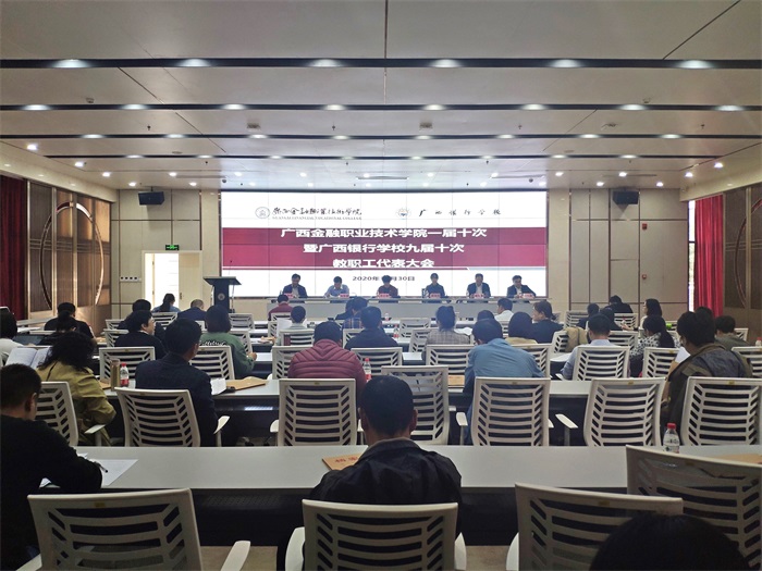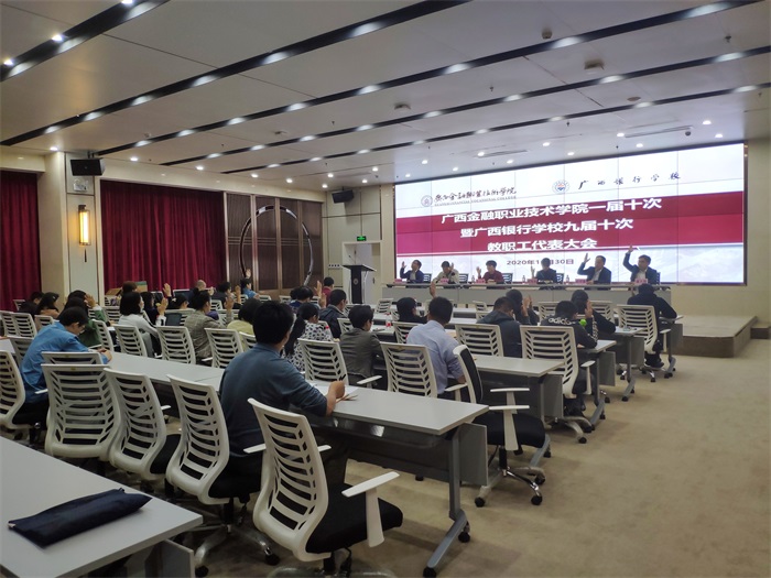 10月30日,awc77万象城官网一届十次暨广西银行学校九届十次教职工代表大会在西校区道德大讲堂召开。38名正式代表、16名列席代表参加了本次会议。