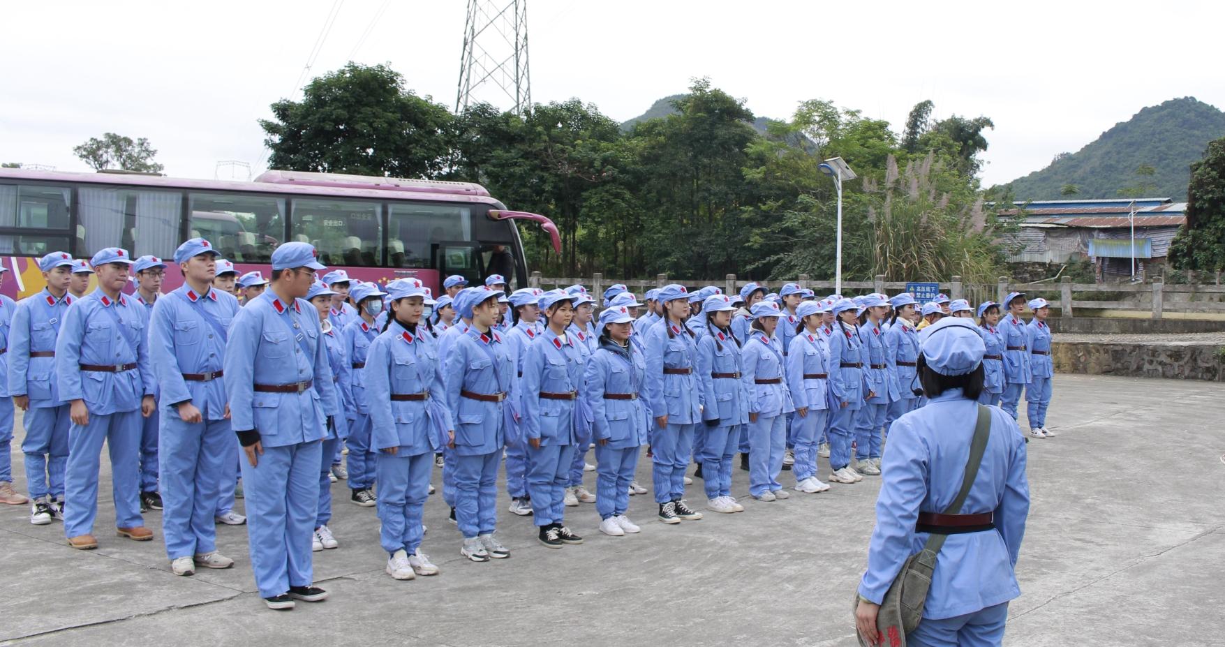 田东,是一片有着光荣革命历史的红土地,是邓小平等老一辈无产阶级革命家踏上右江地区第一脚、打响百色起义第一枪的地方,是广西第一块红色政权——右江苏维埃政府所在地。来到田东县思林镇真良村,编队整训授旗授枪仪式后,学员们开启实践教学第一程——重走运枪小道。扛着红旗沿着陡峭石壁挺进,背着长枪踏着蜿蜒山路前行,感受红军在陡峭的小道上运载武器的艰辛。学员们重走这段崎岖山路,在最为泥泞艰险的运枪小道上,一边行进,一边弯着腰传着口令,还时不时地前后照应,艰难跋涉两公里,歌声飘扬两公里,依然斗志昂扬。