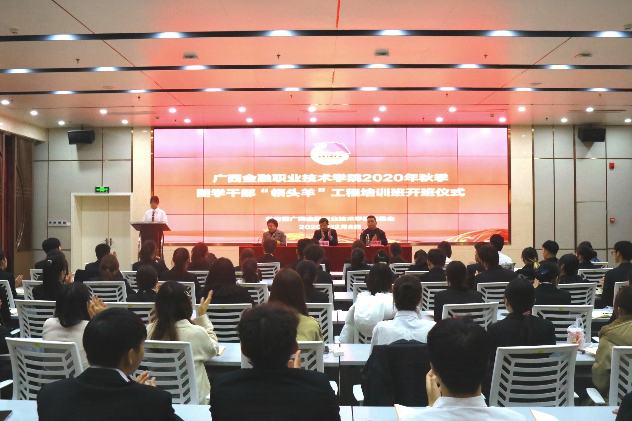 为提高团学干部的思想政治基础、综合实践能力,培养和造就一支政治坚定、作风过硬、素质全面、能力突出的团学干部,12月8日晚,万象城官网在西校区道德大讲堂举行2020年秋季团学干部“领头羊”工程培训班开班仪式。学校党委副书记、纪委书记刘华政,学生工作与招生就业处副处长、校团委书记周海峰、校团委副书记朱丽君,以及团学干部“领头羊”工程培训班的122名学员参加开班仪式。开班仪式由校团委副书记朱丽君主持。
