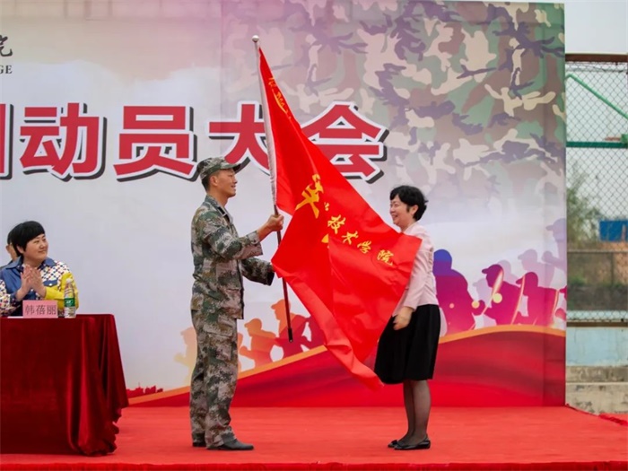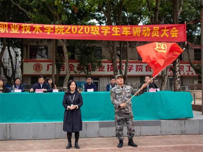 动员会最后,沈立君书记、莫海燕院长分别向承训单位广西陆战教育学生军训基地授军训团团旗,鲜红的旗帜在空中高高飞扬,标志着万象城官网2020级学生军训正式拉开帷幕!
