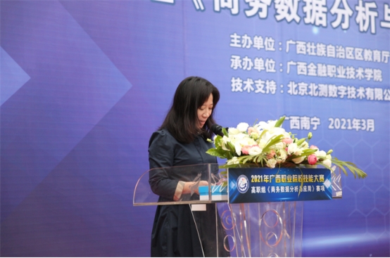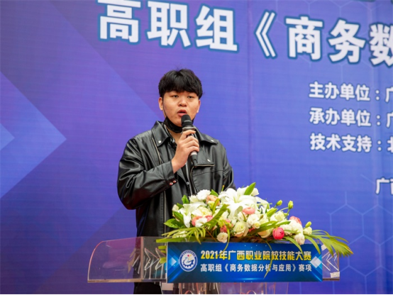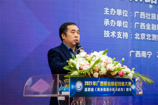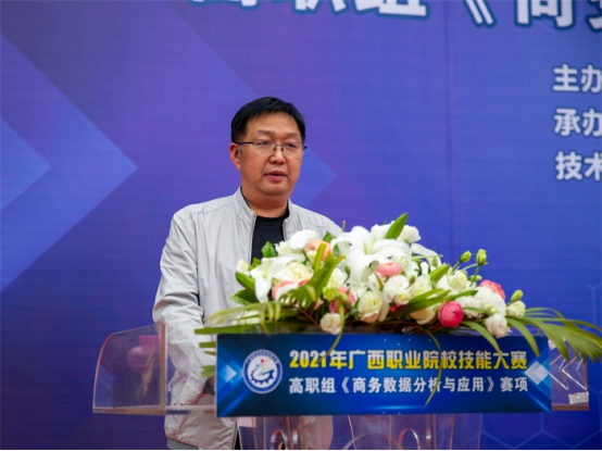 开幕式上,莫校长致开幕词,对出席竞赛的各位领导、来宾、全体裁判员、参赛选手表示热烈欢迎,向本次比赛的技术支持企业表示衷心的感谢,对所有为举办本次大赛付出辛勤劳动的工作人员表示亲切的问候。莫校长表示,“商务数据分析与应用”是顺应了广西数字经济产业发展的需要。本次大赛为我区职业院校师生切磋技艺和交流提供了良好平台,希望通过本次竞赛进一步提高学生职业技能与市场需求的吻合度,推动我区商务大数据高技能人才的成长成才,为建设壮美广西、共圆复兴梦想提供强有力的技能人才支撑。祝愿所有参赛选手以良好的心态参加比赛,充分发挥技能才干,赛出风格,赛出水平,以良好的姿态开启“十四五”的新征程!