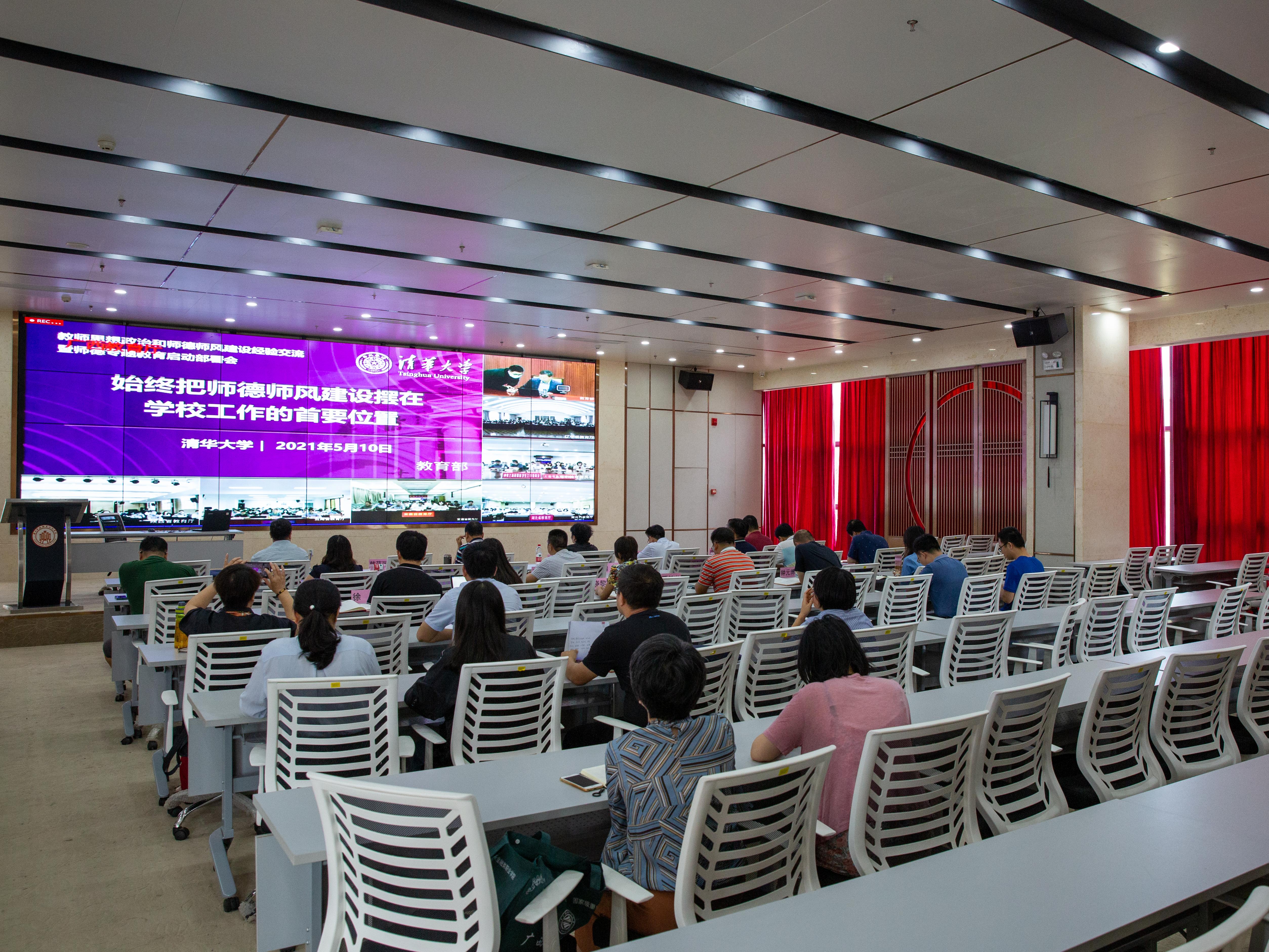 5月10日,教育部召开教师思想政治和师德师风建设经验交流暨师德专题教育启动部署会,万象城官网组织校领导、各党支部书记、相关部门负责人在西校区道德大讲堂参加视频会议。