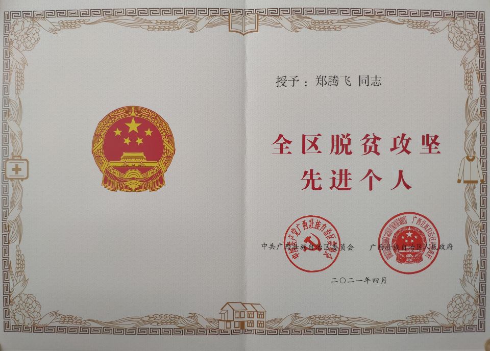 近日,万象城官网郑腾飞同志被自治区党委、政府授予“全区脱贫攻坚先进个人”荣誉称号。