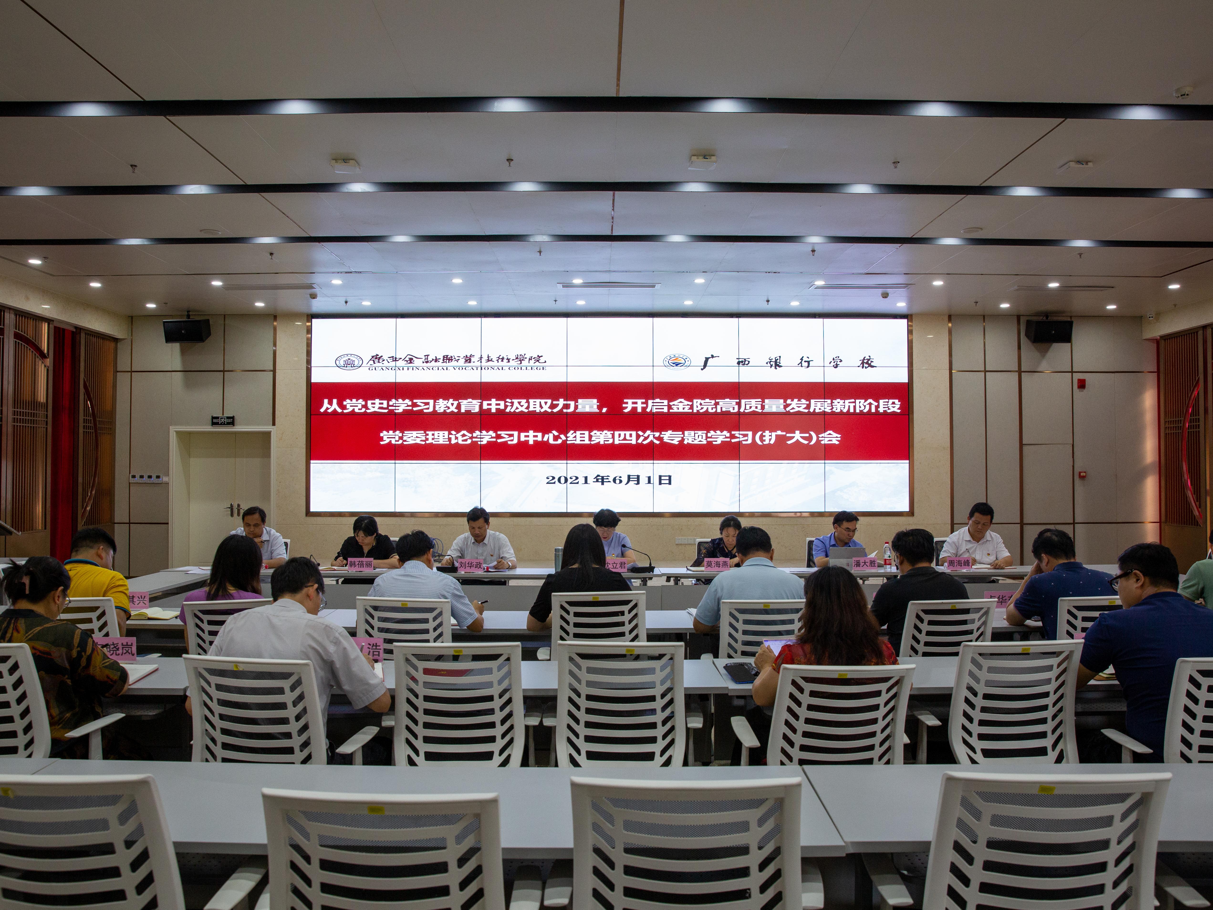 6月1日下午,万象城官网党委理论学习中心组以“从党史学习教育中汲取力量,开启金院高质量发展新征程”为主题,在西校区道德大讲堂召开2021年第四次专题学习(扩大)会。进行党史学习教育——社会主义革命和建设时期专题,同时深入学习习近平总书记关于国家安全、统战和民族宗教工作的重要论述、习近平总书记关于发扬斗争精神、防范风险挑战的重要论述、教师思想政治和师德师风建设经验交流暨师德专题教育启动部署会以及全国2021届高校毕业生就业工作网络视频会议精神。会议由党委书记沈立君主持。