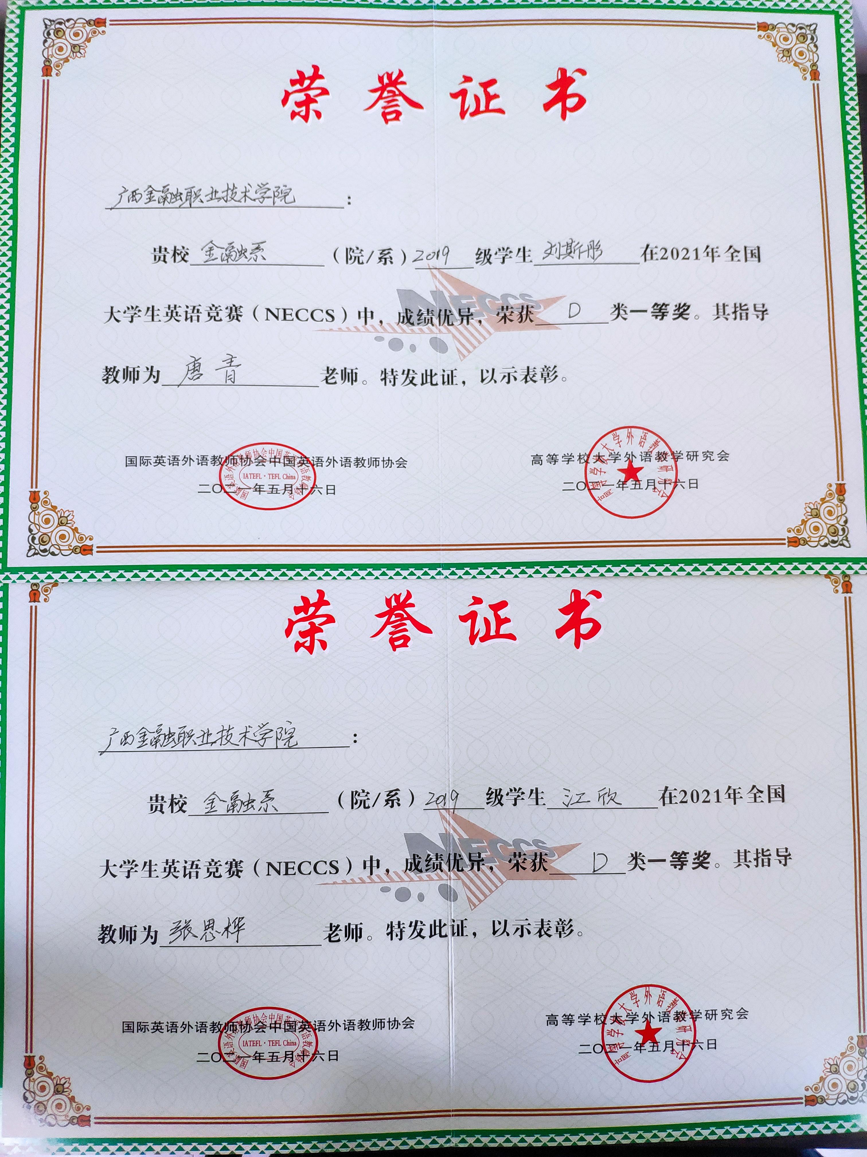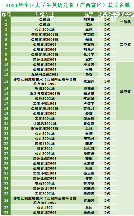 近日,全国大学生英语竞赛组委会传来喜讯,万象城官网学子在2021年全国大学生英语竞赛中表现优异,荣获佳绩。其中,金融系刘斯彤、江欣两位同学获得了全国大学生英语竞赛广西赛区一等奖的好成绩;王颖、李杰霞等7位同学获得了广西赛区二等奖,邓义婷、何美等11位同学获得了广西赛区三等奖,曹金燕、张耀元等56位同学获得了广西赛区优胜奖。万象城官网公共基础部教师唐青、张思桦荣获优秀指导教师奖,学校荣获优秀组织奖。
