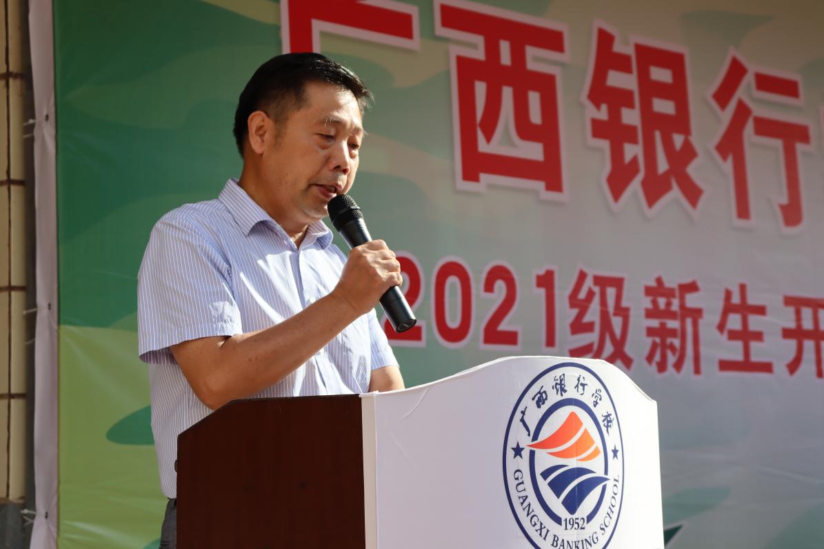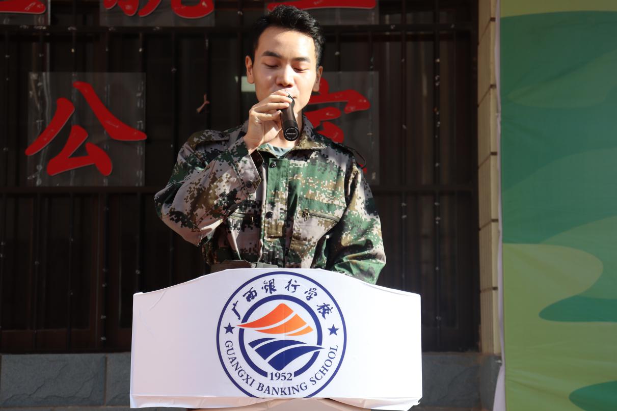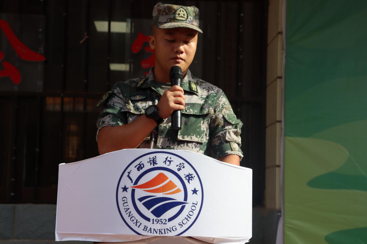 广西银行学校管委会副主任陈瑞强作新生军训动员讲话,希望同学们敢于吃苦,敢于锻炼,服从命令、听从指挥,切实做到军人"流血流汗不流泪,掉皮掉肉不掉队"的要求,达到强体能、练毅力、知军事、明纪律的目的。