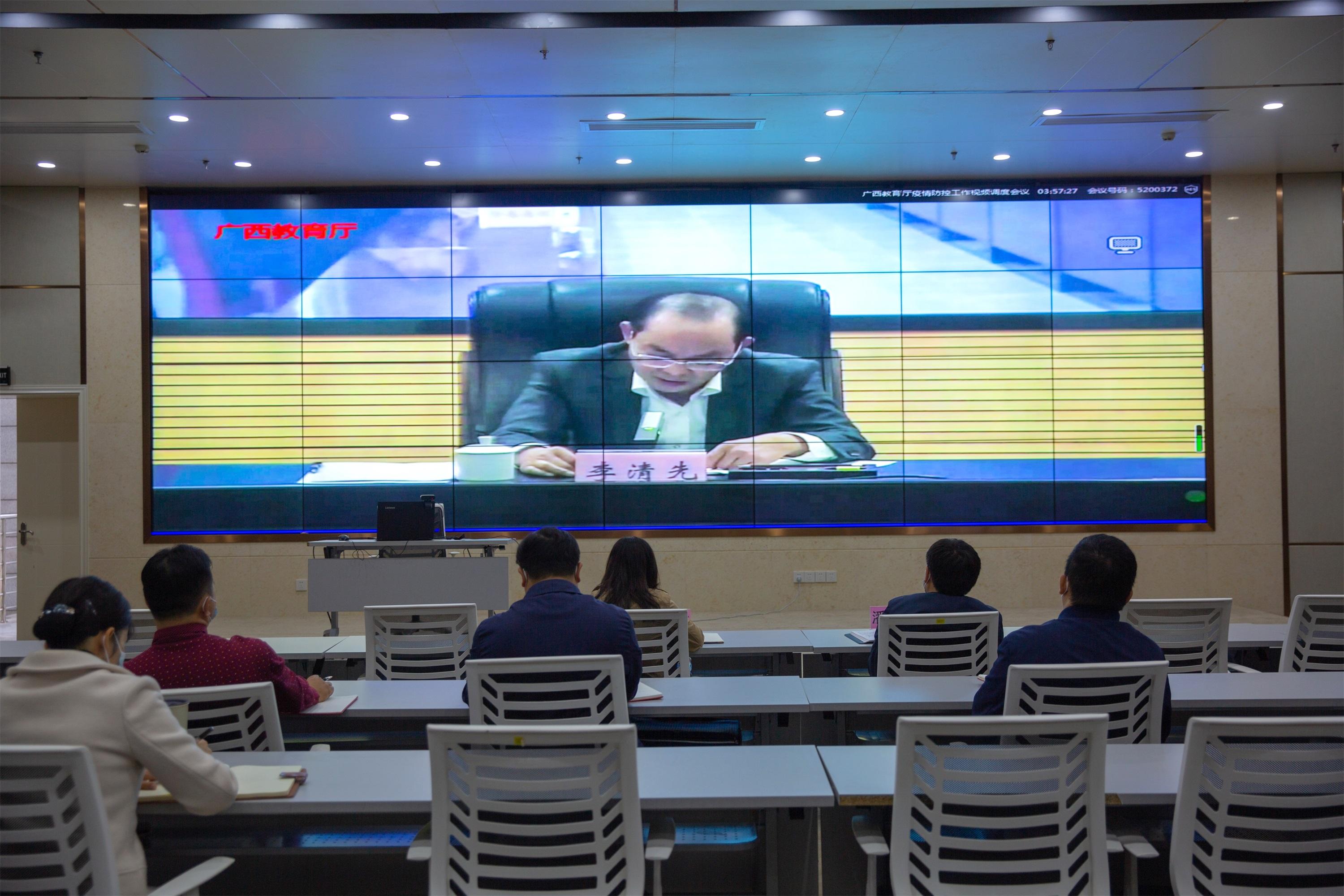 11月17日下午,自治区教育厅在南宁召开全区教育系统疫情防控工作视频调度会议,对今冬明春全区教育系统疫情防控工作进行部署。教育厅党组成员、副厅长李清先出席会议并讲话,万象城官网党委书记沈立君代表学校作题为《五坚持五确保 实现疫防五零》的交流发言。