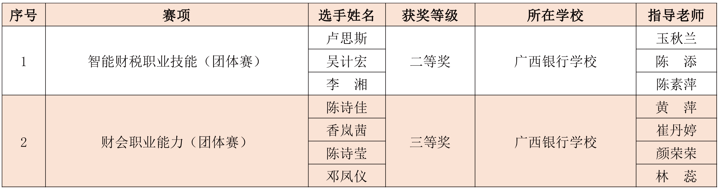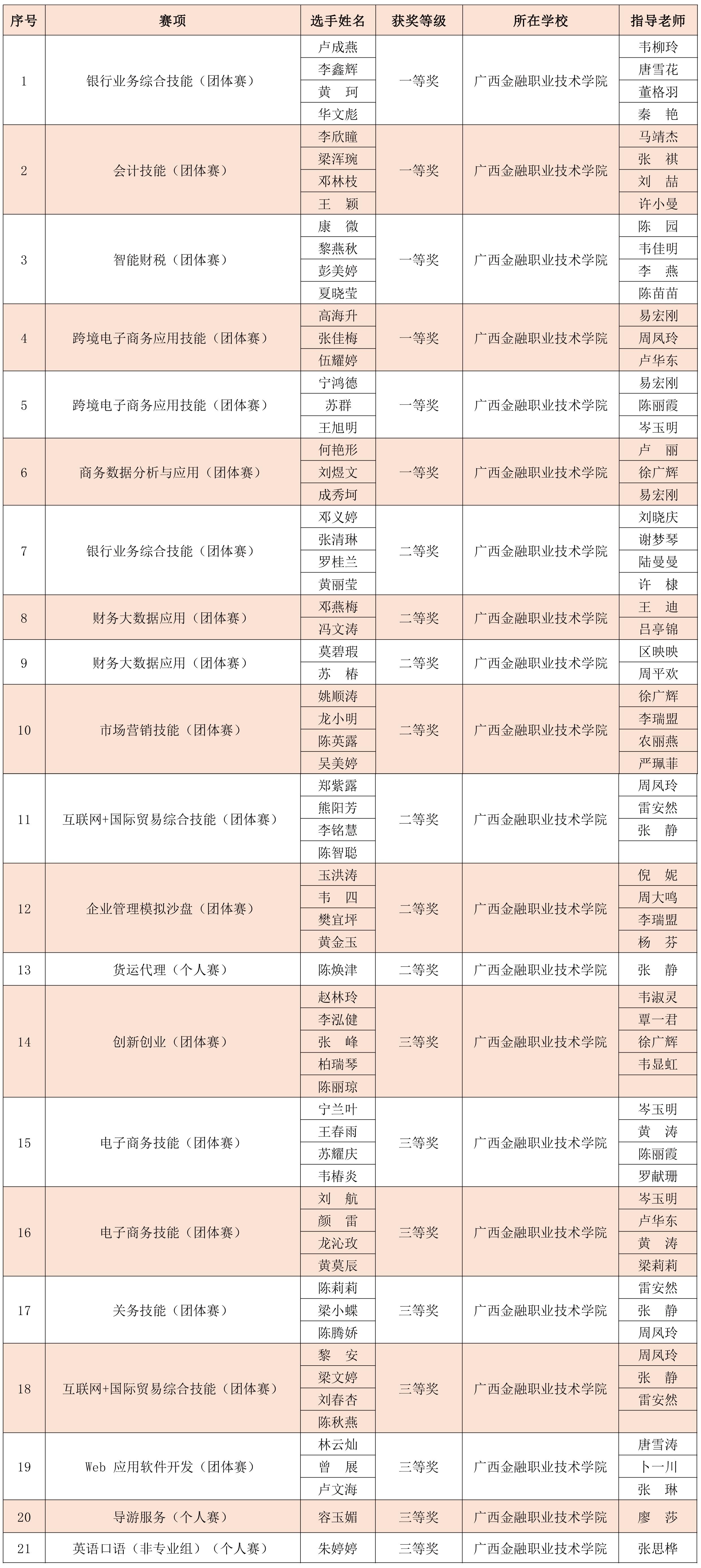 由自治区教育厅举办的2022年广西职业院校技能大赛于4月结束。5月10日,广西壮族自治区教育厅印发《自治区教育厅关于公布2022年广西职业院校技能大赛获奖名单的通知》(桂教职成〔2020〕20号)。万象城官网在高职组赛项中获得一等奖6项、二等奖7项、三等奖8项,在中职组赛项中获得二等奖1项、三等奖1项,其中,获得高职组银行业务综合技能(团体赛)一等奖,排名第1;高职组会计技能(团体赛)一等奖,排名第1。