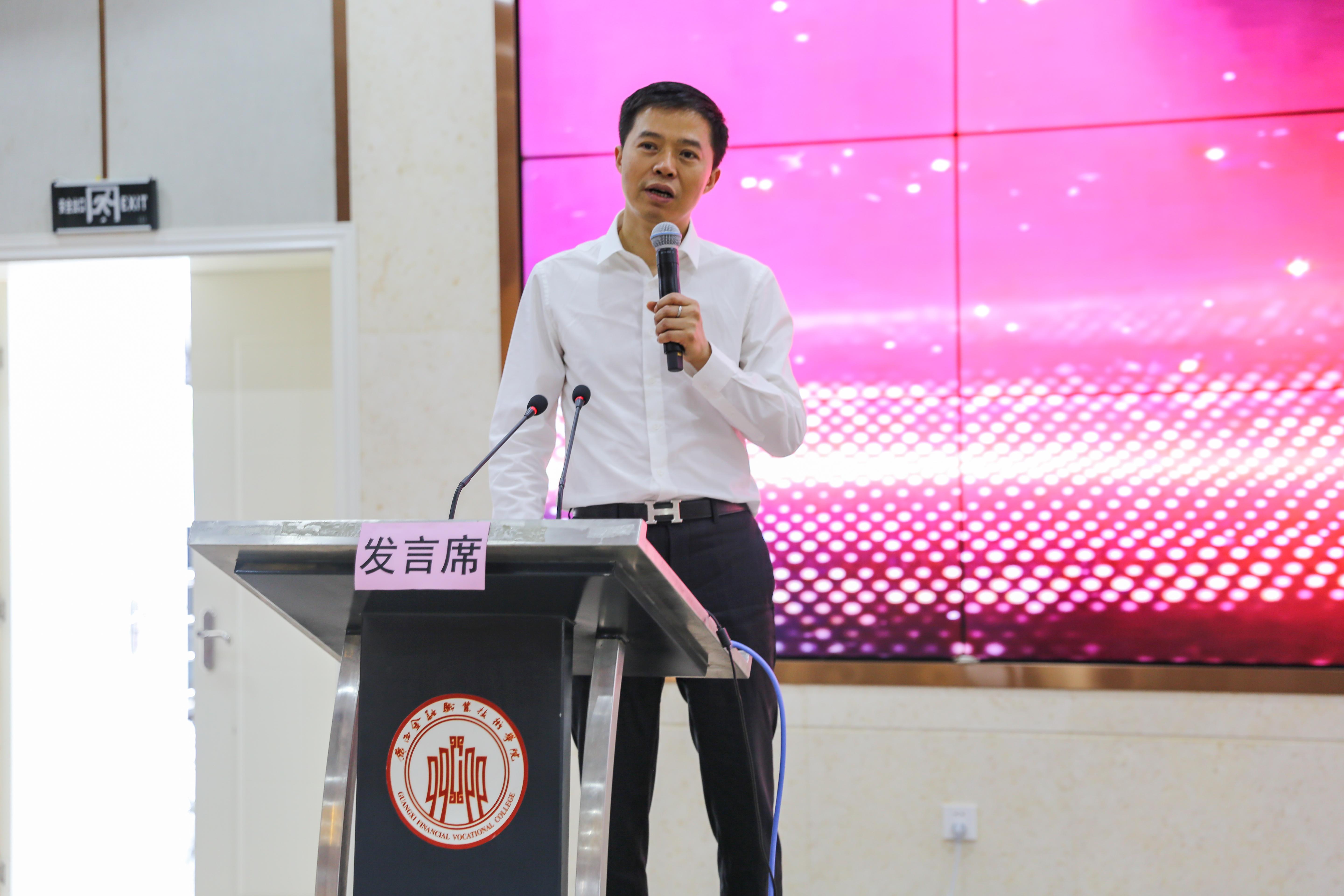 随后,新道数智财会产业学院广西区高级教育规划顾问黄河景对产业学院的实施及进度安排进行介绍,他介绍了公司基本情况、发展战略、校企合作情况,并对双方今后加强紧密合作提出了建议。