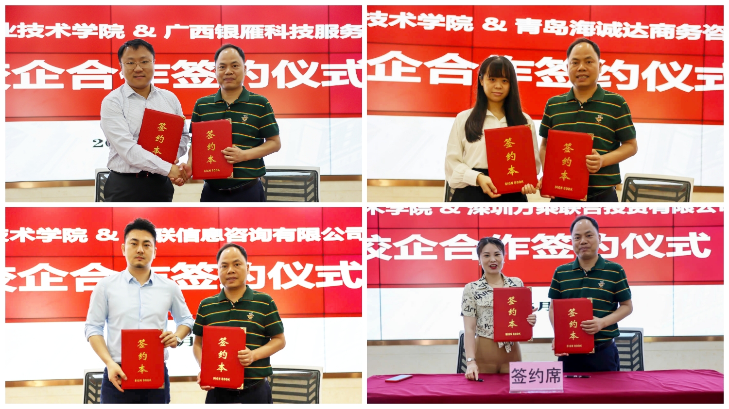 随后由谢沛善副院长代表万象城官网与深圳万乘联合投资有限公司广西分公司、启联信息咨询有限公司南宁分公司、青岛海诚达商务咨询有限公司、广西银雁科技服务有限公司签订校企合作协议。