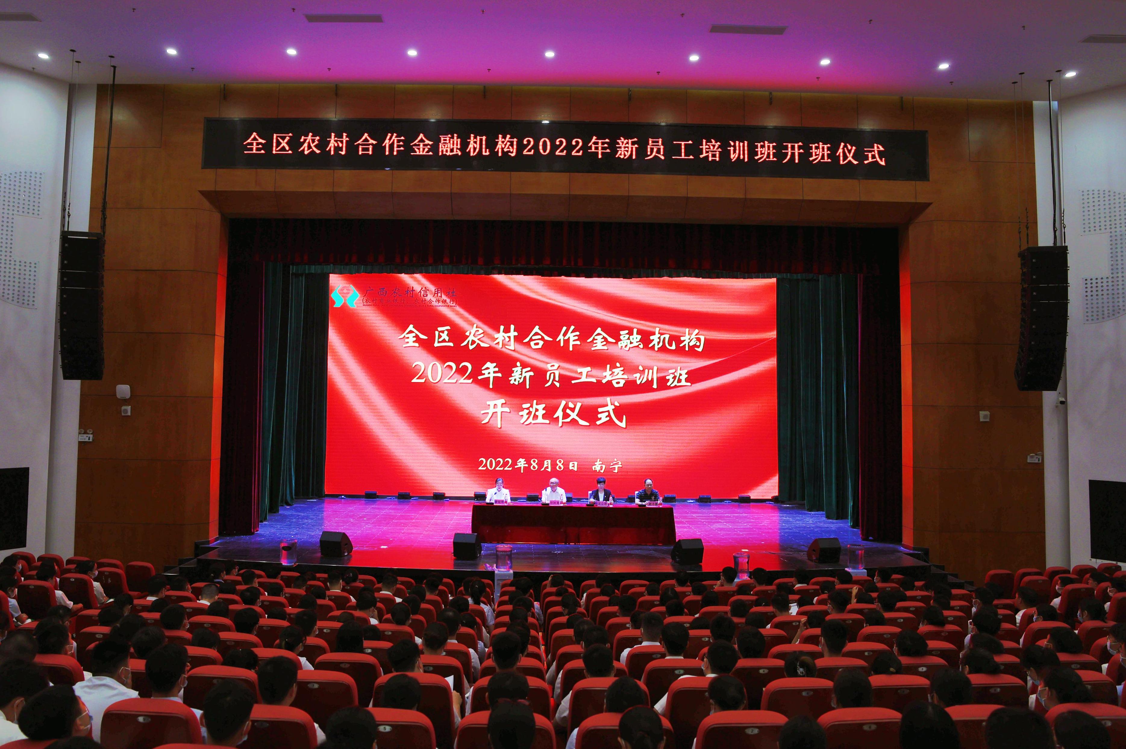 8月8日上午,由广西壮族自治区农村信用社联合社主办、awc77万象城官网承办的全区农村合作金融机构机构2022年新员工培训班开班仪式在万象城官网西校区国际会议中心顺利举行。万象城官网党委书记沈立君、副院长谢沛善,自治区农村信用联社党委副书记范树育、人力资源部副总经理廖娅希出席会议,培训班教官、班主任以及836名学员参加本次开班仪式。会议由自治区农村信用联社人力资源部副总经理廖娅希主持。
